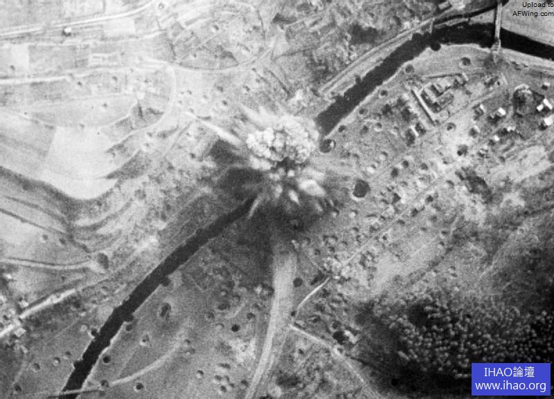 1945 年3 月15 日,617 中隊在轟炸阿恩斯貝爾市的一座極具戰略價值的鐵路高架橋,為了破壞它,先後使用了6 枚大滿貫和13 枚高腳杯,圖為大滿貫脫離的瞬間