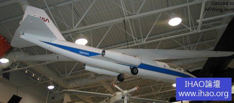 從波音2707 模型抬頭看,就是AD-1 斜翼研究機。從氣動上來說,飛機最大的奧秘就是機翼。從平直翼到後掠翼,這是飛行技術的一個突破,開創了高速飛行的新時代。後掠角越大,高速飛行阻力越小,但低速飛行的性能越糟。變後掠翼是一個兩全其美的好辦法,但機械複雜,重量很大,曇花一現就退隱江湖了。可是空氣有一個很好的性質,只有有一個“掠”,前掠還是後掠並不在乎,一邊前掠、一邊後掠也不在乎,於是有了斜翼。更好地事情是,斜翼可以以機體為支點,在平直翼和大後掠/大前掠翼之間方便地改變。由於這不像變後掠翼對變後掠鉸的應力非常集中,斜翼本身是剛性和一個整體,產生的勝利在兩邊平衡,變後掠鉸的受力情況極大地簡化,機械複雜性和重量都大大降低。AD-1 就是​​NASA 的斜翼研究機,成功地試驗了變後掠的斜翼。