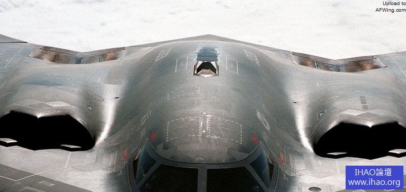 發動機進氣口遠離機翼前緣,以避免被來自下方的雷達波照射到。由於肥厚的飛翼結構,B-2 可以把發動機深深地埋在飛翼內,飛翼的上表面的扁平的進氣口和彎曲的進氣道可以保證機載雷達無法從上方直接照射到發動機的正面,從下方就更不可能了。這樣B-2 可以採用較簡單的進氣口,只需要在唇部作尖齒修形就沒有問題了。但是翼上進氣口存在另一個問題,氣流要流經飛翼的上表面一段距離才能進入進氣口,加劇了邊界附面層的問題,所以亞音速的B-2 的進氣口也採用了常規的分離板吸除槽口,和進氣口唇部一樣,也做了尖齒狀的隱形修形