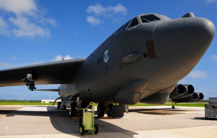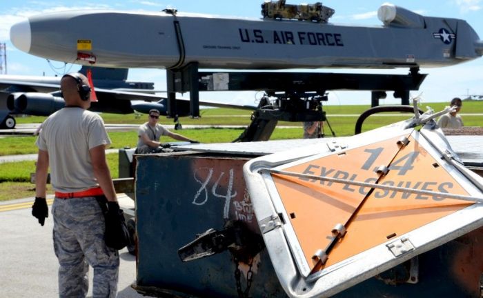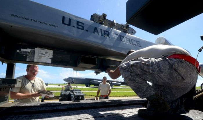 2012年10月17日,關島安德森美國空軍基地內,空軍第96遠征飛機維修單位下屬第36遠征飛機維修中隊,正在進行B-52H戰略轟炸機加裝AGM-86B巡弋飛彈訓練,已訓鍊該中隊的戰時維護能力。圖中準備裝載的AGM-86B型巡弋飛彈可能只是訓練彈(未加裝核彈頭)。