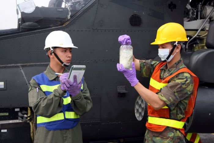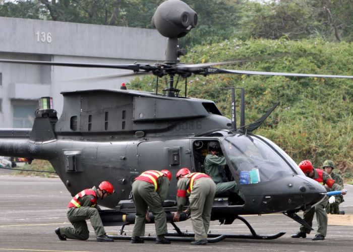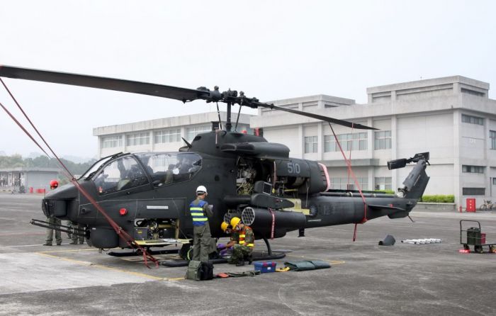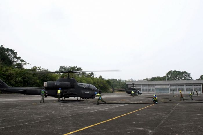 而為強化戰備整備作為,攻擊直升機與戰搜直升機,正在進行熱加油與熱掛彈演練,在直升機引擎不熄火下,地面作業官兵,攜油管搶進機側實施加油與掛彈,順利完成所有作業。