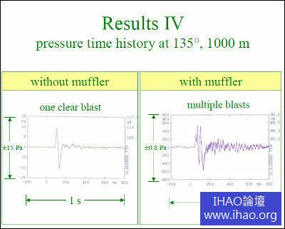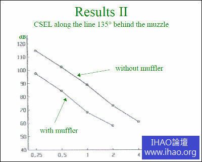 左圖顯示的是,不安裝滅音器時氣體的動能在砲彈射出的一瞬間全部爆發出來,音爆與震波也隨之發生;而右圖顯示的則是裝設滅音器的數據,測試的結果發現,動能被削減成無數個細小的聲波,最開始的能量釋放也輕微許多