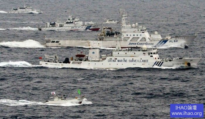 可以看到中共海監66號船正在釣魚台海域高速航行,海監66號左舷是日本海上保安廳船隻,右舷側是日本右翼人士搭乘的漁船。