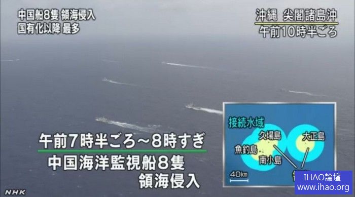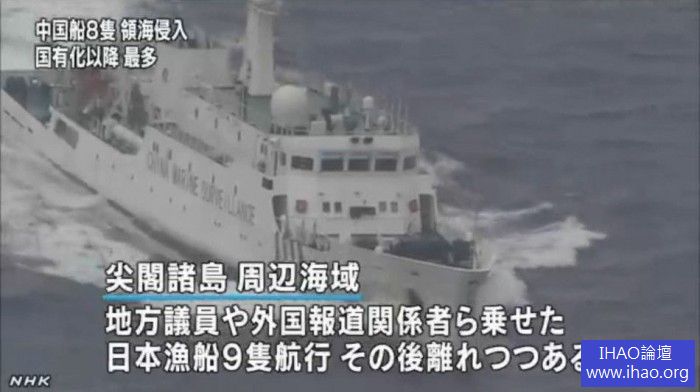 日本80多名右翼人士22日晚間乘船於23日上午進入釣魚台,8艘中國大陸海監船駛進鄰近爭議釣魚台列嶼附近12海里海域,這是日本宣布釣魚台「國有化」後,中共船隻進入鄰近海域單日最多紀錄。