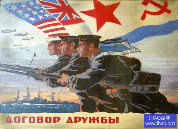 第二次世界大戰期間的一幅宣傳海報,保存在莫斯科的偉大衛國戰爭博物館。海報展示了3名手持步槍的美國、英國和蘇聯士兵,象徵這3個大國之間的合作。衛國戰爭博物館專門設立了一個展區,通過相關展品講述盟軍為打敗法西斯做出的努力。