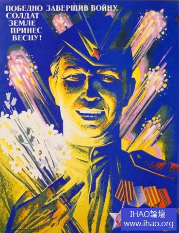 一名參加偉大衛國戰爭的蘇聯紅軍,海報上印有“贏得這場戰爭,士兵們便為這片土地帶來春天”字樣。