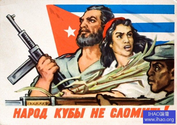 端著機關槍的古巴革命者與手持甘蔗的婦女站在古巴國旗前。海報上的俄文意為“古巴人民無法打敗”。