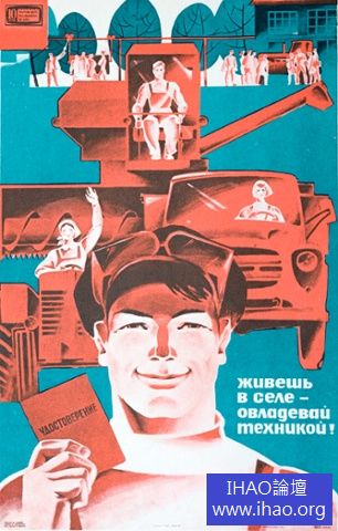 展示灌溉、飛機噴灑農藥等現代農業技術的宣傳海報。海報上的俄文意為“為了獲得豐收,最大限度地發掘集體生產力”
