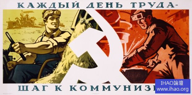 1968年的一幅海報,展示了蘇聯的農民和鋼鐵工人。海報上的俄文意為“每一天的工作都朝著共產主義邁近一步。