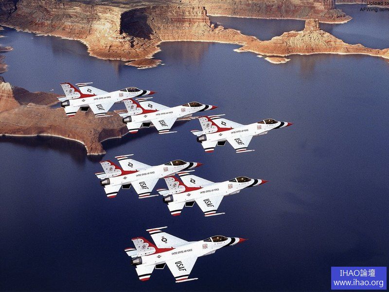 美國空軍的“雷鳥”飛行表演隊在1953 年成立,從共和F-84“雷電”戰鬥機開始,先後使用北美F-100“超級軍刀”、共和F-105“雷公”、麥克唐納F- 4“幽靈”戰鬥機。不過在70 年代石油危機期間,“雷鳥”曾換裝諾斯羅普T-38 教練機,儘管符合表演要求,燃油消耗量只有F-4“幽靈”的1/5,維修也要簡單得多,但不夠威猛,不符合“雷鳥”一貫使用第一線戰鬥機的傳統,所以只在1974 到1981 年間使用了7 年,就換裝通用動力F-16“戰隼”了,現在還在繼續使用。當然仔細的人會發現,“雷鳥”的F-16 實際上已經換裝了三代,80 年代的F-16A Block 15 在90 年代換裝為F-16C Block 32,從2009 年開始,雷鳥的F-16 已經換裝成美國空軍最新標準Block 52,採用更大推力的普拉特惠特尼F100-PW-229 發動機,航電也已經更新到最新水平。