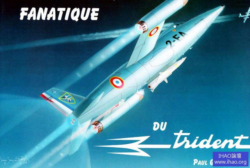 在二戰期間德國人對火箭/噴氣混合動力戰鬥機研究成果的基礎上,法國開展了一系列研究工作,並成為了50年代混合動力戰鬥機研究的先驅。其突出成果便是法國西南航空製造公司(Sud-Ouest)及其非凡的“三叉戟”戰鬥機。該機是作為一種擁有快速爬升性能並具備攔截敵轟炸機能力的區域防空戰鬥機,其外部掛載的火箭引擎可為該機提供突出的飛行速度、高度以及爬升性能。“三叉戟”戰鬥機最終未能服役,其混合動力設計為常規的渦輪噴氣引擎所取代,同時也不再是嚴格的單一任務的戰鬥機。