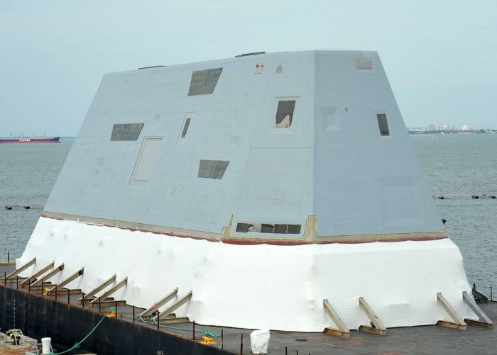 2012年10月6日,美國海軍DDG1000未來飛彈驅逐艦的科幻造型艦橋在天氣好轉後運抵諾福克海軍基地。可能將在這裡進行一些測試任務。