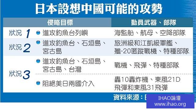 防衛省認為中共若侵略釣魚台,可能動用2艘航空母艦威壓日方,並以空降部隊與水陸兩用戰車進行登陸作戰。自衛隊軍官認為,釣魚台與石垣、宮古島屬同戰區,中共將動用旅洲級驅逐艦、江凱級護衛艦、殲-20戰機發動波狀攻勢,並以飛彈擊毀航空自衛隊雷達站,刺瞎日本防禦網的雙目後,再趁亂以特種部隊佔據宮古機場與石垣機場。