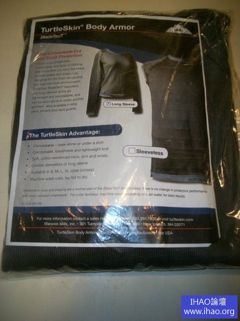 TurtleSkin(龜甲)的防護裝備涉及了很多領域,包括防彈衣、護甲、戰術手套等。TurtleSkin(龜甲)出品的長袖防護服,就是由Warwick Mills的高性能復合纖維材料製成。這款防護服不僅可以大幅度減輕外界刀具劃傷或針刺的帶來的危害,提供超強的防護能力,而且兼顧了透氣、舒適、輕薄這些特點。由於防護服富有彈性,且款式收身,使用者既可以直接把它穿在外面,也可以在襯衫下或是任何單衣內使用它,其隱蔽性非常好。防護服的衣領處經過了聚酯材質增強處理,因此這一部分絕不會輕易變形。