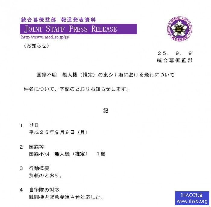 日本防衛省統合幕僚監部發佈9月9日飛臨釣魚島上空“不明國籍”無人機照片。從日方公佈的線路圖看,該無人機從中國方向接近釣魚島,然後繞島一圈後原路返回。另外從公佈的照片看,應該是一款大型遠端無人機,可能為螺旋槳動力。