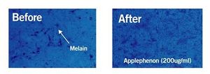 不只防禦,更要全面擊退即將出現的未來斑點!DR.WU肌膚團隊堅持使用來自日本未熟成之高品質蘋果,淬煉出多酚含量高達98%純度的蘋果多酚Applephenon®,分子細小的特性,能迅速進入腸胃及血液系統,在人體內快速被吸收及利用;豐富的多重花青素多酚,則能協同維他命B2及B3進行「雙倍驅黑作用」,積極、強勢減緩酪氨酸酶的活性作用,阻斷黑色素關鍵形成步驟,抑制肌膚中已形成之黑色素的轉移、累積(見附圖一),消滅即將產生的未來斑點!同時,加強促進細胞自主新陳代謝,快速修復因紫外線照射而受損的肌膚,提升美肌底層亮白透亮度,呈現自然紅潤的白皙膚色。