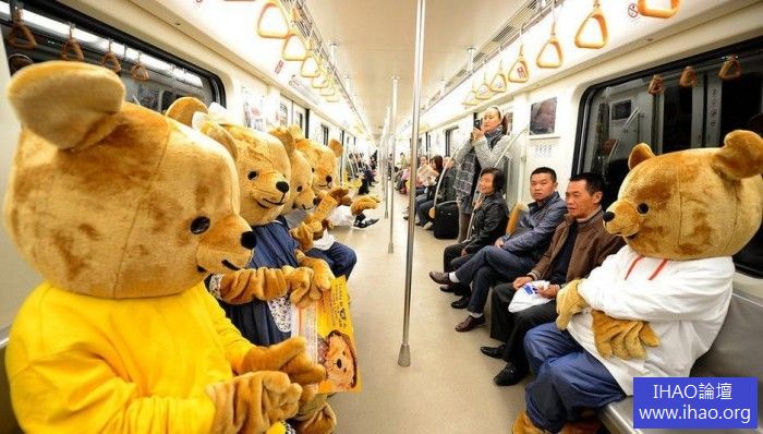 四川省成都市,『泰迪熊』乘坐地鐵。大陸首家泰迪熊博物館將在成都溫江開館。當日,一群扮演『泰迪熊』的演員在成都地鐵二號線和春熙路,向市民宣傳。