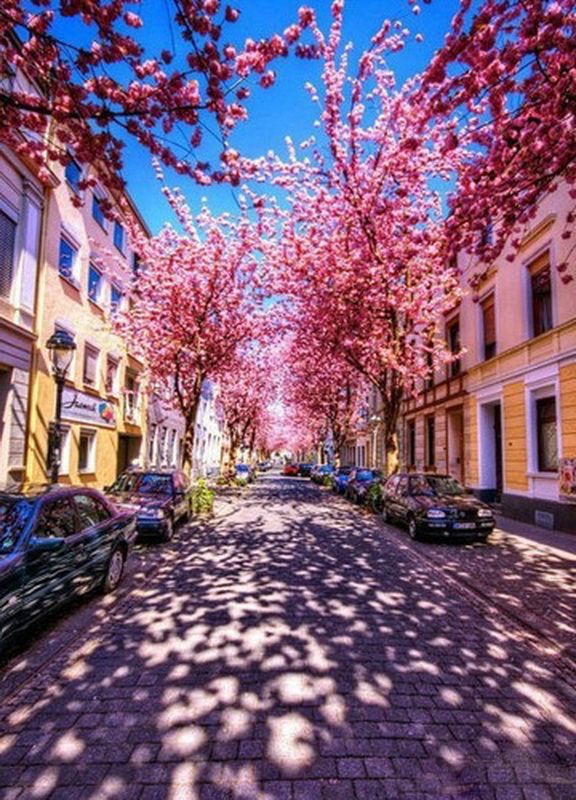 波恩是一個極具田園風情的城市,它明顯區別于其他城市的特點是它的安閒、舒適及濃重的鄉土氣息。這是個由許多村莊組成的城市,如萊塞尼希、凱塞尼希、杜依斯村、萊恩斯村、波潑爾斯村、于克爾斯村、依彭村等等,它們至今仍保持著自然的鄉村風貌。這正是這樣波恩的道路也別具風格,Cherry Brick Road是一條全球著名的道路,道路兩邊皆是櫻花,形成的道路景象有別于櫻花之國日本,少了一絲禪意,卻多了一縷歐式的浪漫情懷!櫻花燦爛下,只為在最美的時刻遇見最美的你!