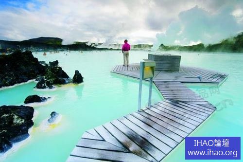 如果你認為這就是所謂的仙境,就應該去看看藍湖(BlueLagoon)。從雷市驅車往凱夫拉維克機場的途中,就路過著名的藍湖。這裡的美立刻讓我把『仙境』的桂冠轉送給它。浸泡在湖水中,湖水白中透藍,呈寶石般異樣的晶瑩剔透,整個泉面上凝聚著雲海一般飄蕩的水蒸氣,碩大的空間內飄拂著淡淡的硫磺味。黝黑粗礪的熔岩石牆圍在湖邊,望向不遠處則可以看到一幢幢地熱發電廠的銀白色建築,而湖中泡著的人們,臉上皆塗滿白色的藍湖矽泥,影影綽綽地在黏滑如絲綢般的藍色湖水裡游走,好像神話故事中的仙境,又仿佛此時此刻我已經遠離人間,置身於另一個奇幻星球。如此美景,冰島真是上帝庇佑的地方啊!