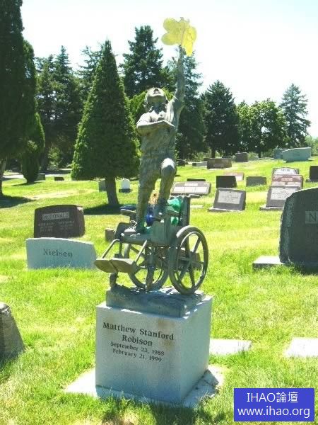 一個年輕男孩從輪椅上向上跳的姿態——這座墳墓的設計顯示了獨特感。輪椅侷限了他生命的大部分時間,而他如今免除了世俗觀念的影響,獲得了『自由』。