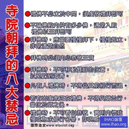 5、拜佛時,不可移動雙腳的位置,以免踩到海青。拜時要將臀部置於腳上,不可翹起,如此才合乎禮儀。動作不緩不急、記憶體虔謹、外現恭敬,則能感應道交。