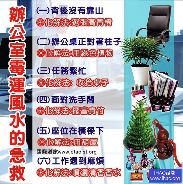 而如果你恰好是在後背無靠的位置上,又不能換位置的話,那可以在椅子的靠背上貼上黃色的硬紙來化解,或能選張高背椅也可。