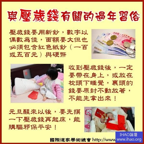 1.壓歲錢要使用新鈔,數字以偶數為佳,面額要大,但也必須包含紅色紙鈔(一百或五百元)與硬幣。