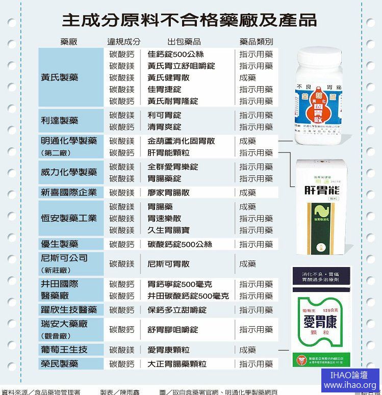 衛福部食品藥物管理署專案清查,發現葡萄王生技「愛胃康顆粒」及明通化學製藥「金葫蘆消化固胃散」、「肝胃能顆粒」等,來自十三家業者廿三項藥品,主成分碳酸鎂或碳酸鈣為食品級或僅有食品添加物許可證。食藥署五年來推動藥廠PIC/S GMP認證,卻未發覺,令人質疑認證破功。