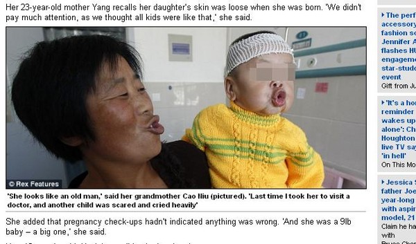 大陸1名1歲的女童玉欣(Yuxin,譯音),罹患罕見疾病「皮膚鬆垂症」 (cutis laxa),臉頰鬆垮下垂、佈滿皺紋,全身上下皮膚也都鬆弛嚴重;若只看臉,會誤以為是6、70歲的老太婆。她除了有皮膚鬆垂問題,還同時患有心臟、肺部疾病,處境讓人相當心疼。