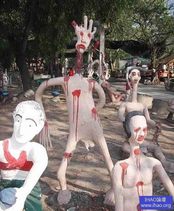 據曼谷40公里處,有一座最離奇的旅遊景點——班派戎寺廟公園maleangpo“地球上的地獄”,你會看到“罪人”被魔鬼折磨的酷刑場面及許多各種恐怖的怪物雕塑,仿佛是“人間地獄”的再現。其實,這些場面都是體現佛教的“六道輪回”及惡有惡報,善有善報的報應理念,無非是通過這種直觀形象的形式勸人行善積德,廣結善緣。