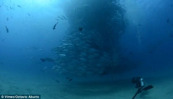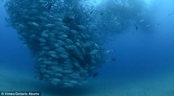 攝影師阿布爾托捕捉到他的朋友兼同是潛水者的卡斯特羅正謹慎靠近這個旋轉運動的巨大魚群。