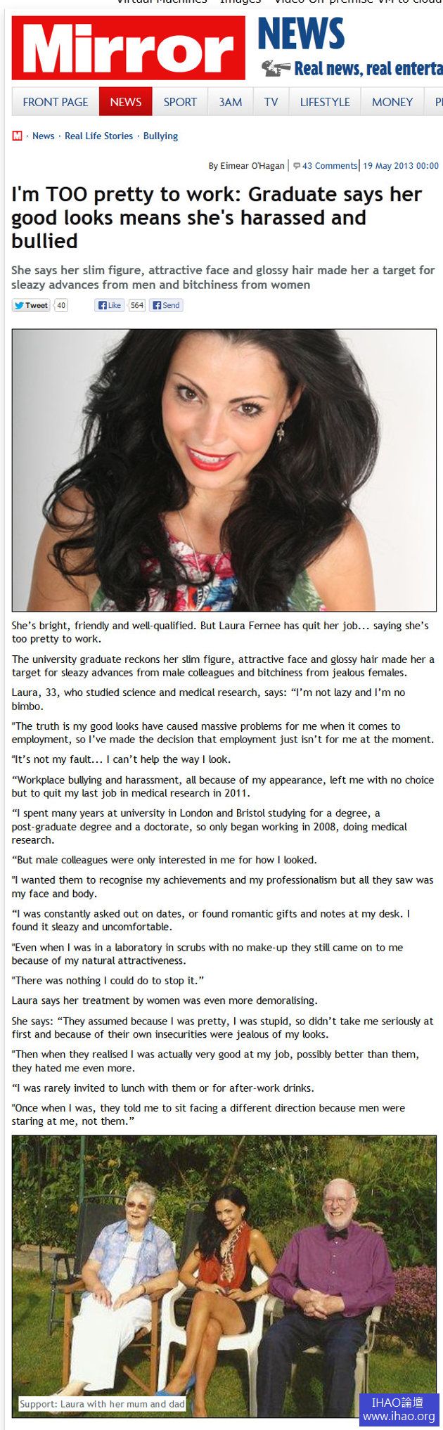 勞拉說,她苗條的身材和漂亮的臉蛋吸引不必要的注意,2008年她在實驗室工作。「男同事們對我感興趣,我希望他們承認我的成績和我的專業,但他們看到的是我的臉和身體。」。她的辦公桌上會有「浪漫的小禮物」,又不時被約,「我覺得那很低俗」。「即使我沒有化妝,他們在仍是衝我來,因為我天生的吸引力」她補充說。