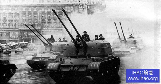 時間過得很快,1949 年5 月,鄂木斯克174 機械廠試制出兩門ZSU-57-2 ,1950 年,牽引式S-60 和自行式S-68 的兩種57 毫米高炮被同時投入國家靶場測試,至1952 年,共有6 輛57 毫米自行高炮投入鑑定試驗,國家防空武器委員會的結論是:該武器系統可靠性高,自動化程度高,打擊範圍廣闊,斜距能夠覆蓋敵攻擊機從進入到投彈射擊再到拉起退出的全部空域,可以在行進間有效保護裝甲和機械化部隊。據庫賓卡國家坦克博物館介紹,ZSU-57-2 於1955 年2 月14 日定型,隨後投入大規模生產,1957 年正式裝備,1957 年11 月7 日的紅場勝利日大閱兵首次公開亮相。