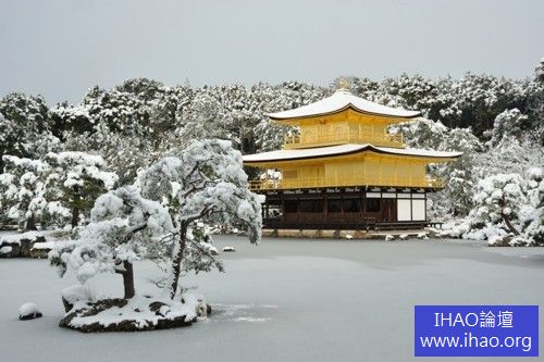 到京都必遊的金閣寺(原名鹿苑寺)於1397年建成,最醒目的舍利殿外牆全以金箔鑲嵌,讓這棟建築遠近馳名,尤其前有靜謐池水,後有蔥鬱山景。儘管舍利殿在燒毀後於1955年依原貌重建,仍是無法撼動的文化財,到了冬天,屋頂與大地一片雪白,金箔外牆更顯晶瑩閃亮。