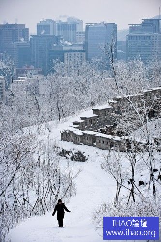 這處位於首爾的公園,最有懷古氣氛的就是舊城牆了,一路往山坡上走,就能眺望地標首爾塔,前景是枯樹、雪地,後景是極現代化的大都市,造就反差的美麗。