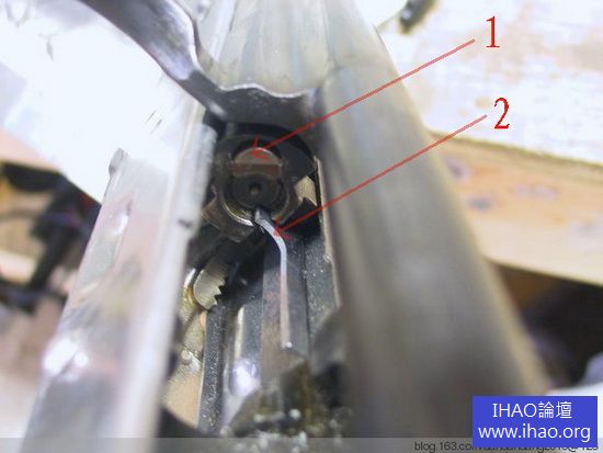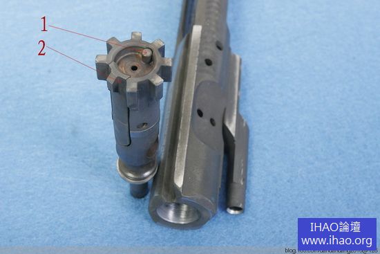 上圖是採用彈性拋殼挺的美國M16 突擊步槍槍機,彈殼拋向右側。圖中1 為拋殼挺,2 為拉殼鉤。下圖採用固定拋殼挺的俄國AKM 突擊步槍,彈殼拋向右側。圖中1 為拉殼鉤,2 為拋殼挺