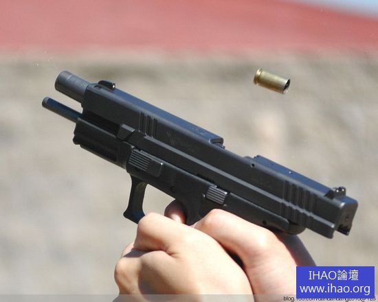 採用固定拋殼挺的美國XD 手槍拋殼瞬間。由於拋殼挺與拉殼鉤共同作用構成了迴轉力矩,因此彈殼是一邊旋轉一邊飛離拋殼窗的,圖中的彈殼正巧旋轉到首尾顛倒的位置上