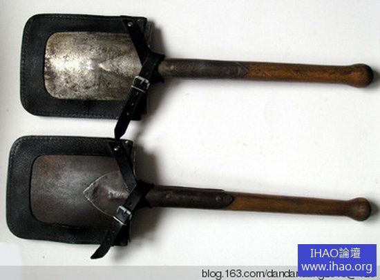 二戰時期的兩把德式工兵鍬。下邊一把是軍用品,上邊一把則是警察等準軍事單位使用的,鍬套均為後彷制的