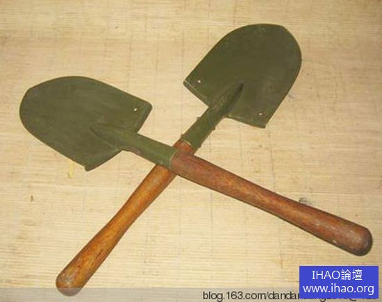 大陸地區最常見的205 型工兵鍬。注意鍬體兩側穿繩索用的小孔。在實戰中這種鍬常常以直接插在使用者背後的方式來攜帶