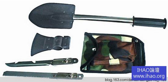 一款大陸地區生產民用組合式多功能鍬的設計,可作為鍬、斧、刀、鋸等使用。但限於材料和工藝,許多類似的設計其實並無實際功用