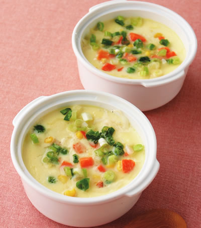 3.將作法1的蛋液盛入容器內,放入作法2的魩仔魚及三色豆,封口包裹上保鮮膜,放入電鍋蒸約10分鐘,取出後撒上蔥花裝飾即可。