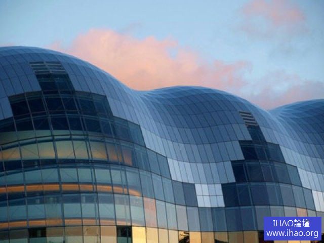 英國蓋茨黑德大廈折射出柔和的波浪形。英國的蓋茨黑德大廈玻璃結構的大廈在陽光的照射下折射出璀璨的光芒,玻璃鏡面中折射出尖銳的幾何狀,或是溫柔的波浪形。兼具美觀與實用功能性,這座蓋茨黑德大廈無疑成為了當今最吸引眼球的建築之一。玻璃鏡面的設計一改往日城市多以灰色為主、盒狀結構建築物的基調,利用光照元素讓外表耀眼奪目,成為城市中的一道靚麗風景。