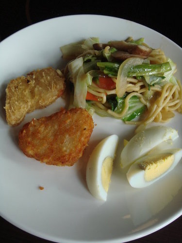 其實他們每一樣菜都還不錯吃(品質都有顧到),像炸雞塊跟薯餅不會軟軟的,而是像剛炸好一樣脆脆的, 生菜的種類也很多,醬汁也有4.5種選擇,蛋糕種類也是多達8.9種吧!有中式也有西式,雖然沒有大魚大肉,但是早餐吃這樣也算是相當豐盛了,東西種類太多了,真不知老闆賺什麼耶!!