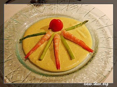 用新鮮蘆筍及活蝦,搭配咖哩優格醬所調製的沾醬