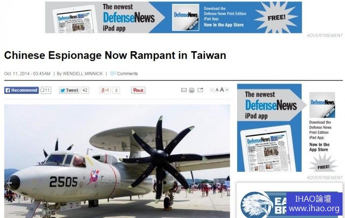 Stolen Info: Taiwan military officers have sold China information on the E-2K Hawkeye airborne early warning aircraft, among other things. (Wikipedia) 翻譯: 台灣軍官販賣E-2K預警機參數與相關資料給大陸!