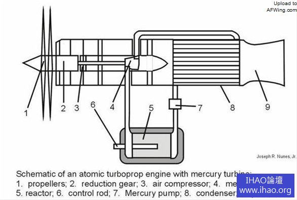 GE 設計的P-1 型核-渦噴發動機設計圖,為直循環系統