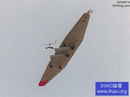 從波音2707 模型抬頭看,就是AD-1 斜翼研究機。從氣動上來說,飛機最大的奧秘就是機翼。從平直翼到後掠翼,這是飛行技術的一個突破,開創了高速飛行的新時代。後掠角越大,高速飛行阻力越小,但低速飛行的性能越糟。變後掠翼是一個兩全其美的好辦法,但機械複雜,重量很大,曇花一現就退隱江湖了。可是空氣有一個很好的性質,只有有一個“掠”,前掠還是後掠並不在乎,一邊前掠、一邊後掠也不在乎,於是有了斜翼。更好地事情是,斜翼可以以機體為支點,在平直翼和大後掠/大前掠翼之間方便地改變。由於這不像變後掠翼對變後掠鉸的應力非常集中,斜翼本身是剛性和一個整體,產生的勝利在兩邊平衡,變後掠鉸的受力情況極大地簡化,機械複雜性和重量都大大降低。AD-1 就是NASA 的斜翼研究機,成功地試驗了變後掠的斜翼。