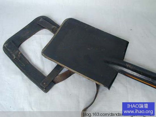 大陸地區最常見的205 型工兵鍬。注意鍬體兩側穿繩索用的小孔。在實戰中這種鍬常常以直接插在使用者背後的方式來攜帶