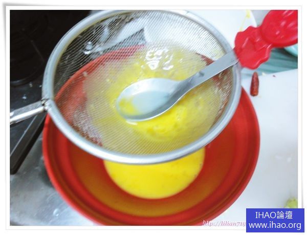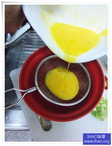 等湯涼的同時,兩顆蛋打成蛋花,過兩次篩。