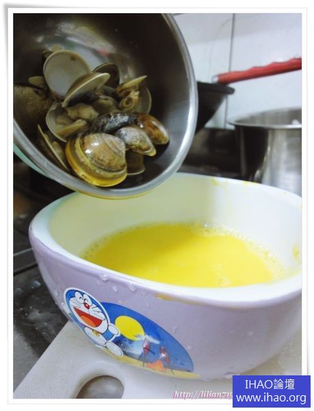 接著把放涼的蛤仔湯倒入蛋液中,蛋與水的比例是1:2(想要蛤仔味濃的,水就全放蛤仔湯;不希望蛤仔湯太重蓋過蒸蛋全部味道,就可以再加水稀釋)。